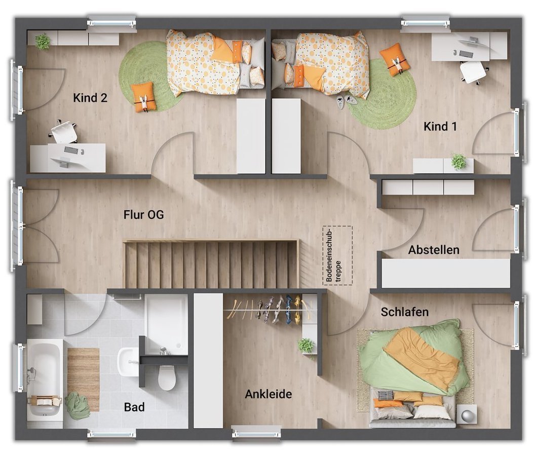 - Eltern- und Kinderbereich im Obergeschoss getrennt durch den Flur